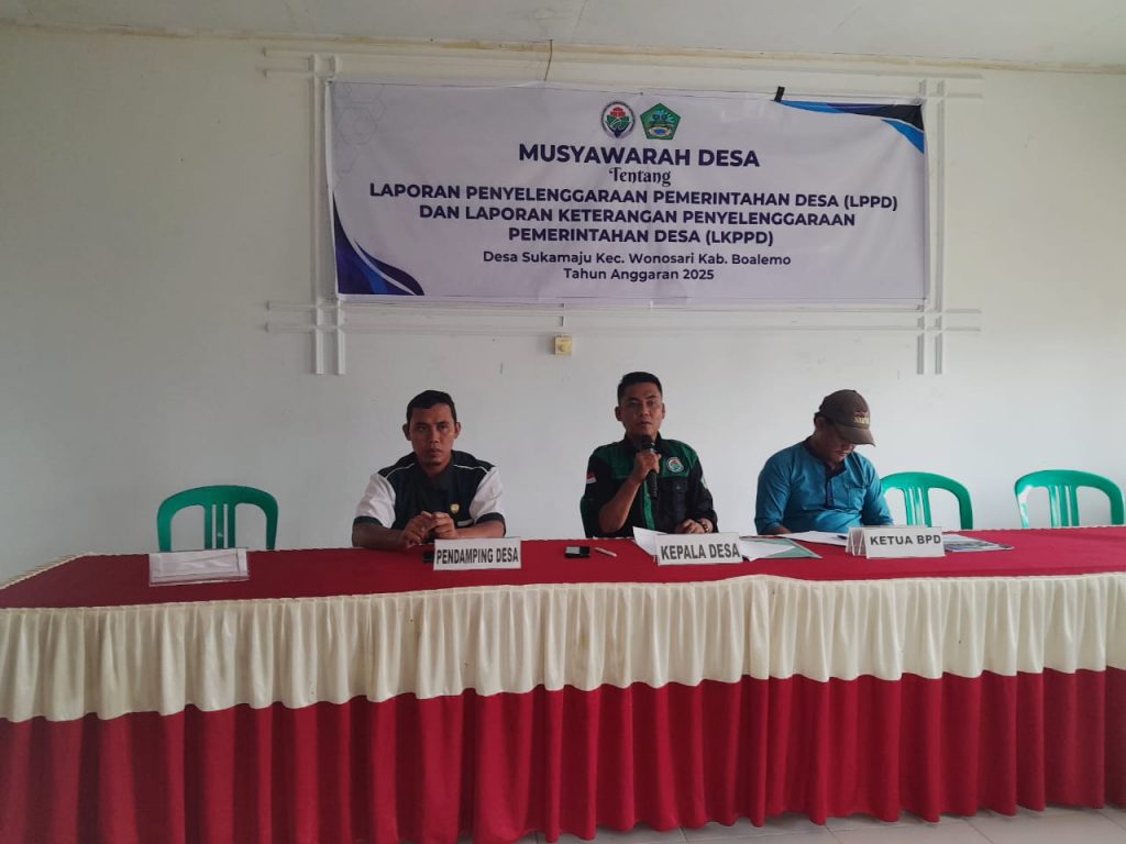 Pemerintah Desa Sukamaju, Kecamatan Wonosari, Kabupaten Boalemo, menggelar Musyawarah Desa dalam rangka pembahasan Laporan Penyelenggaraan Pemerintahan Desa (LPPD) dan Laporan Keterangan Penyelenggaraan Pemerintahan Desa (LKPPD) Tahun 2025, pada Selasa, 17 Maret 2026, bertempat di Aula Kantor Desa Sukamaju.
